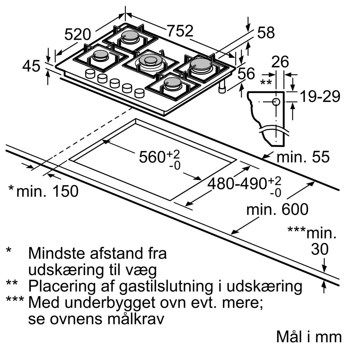 • Krævet niche-størrelse til installation (HxBxD mm) : 45 x 560 x (480 490)