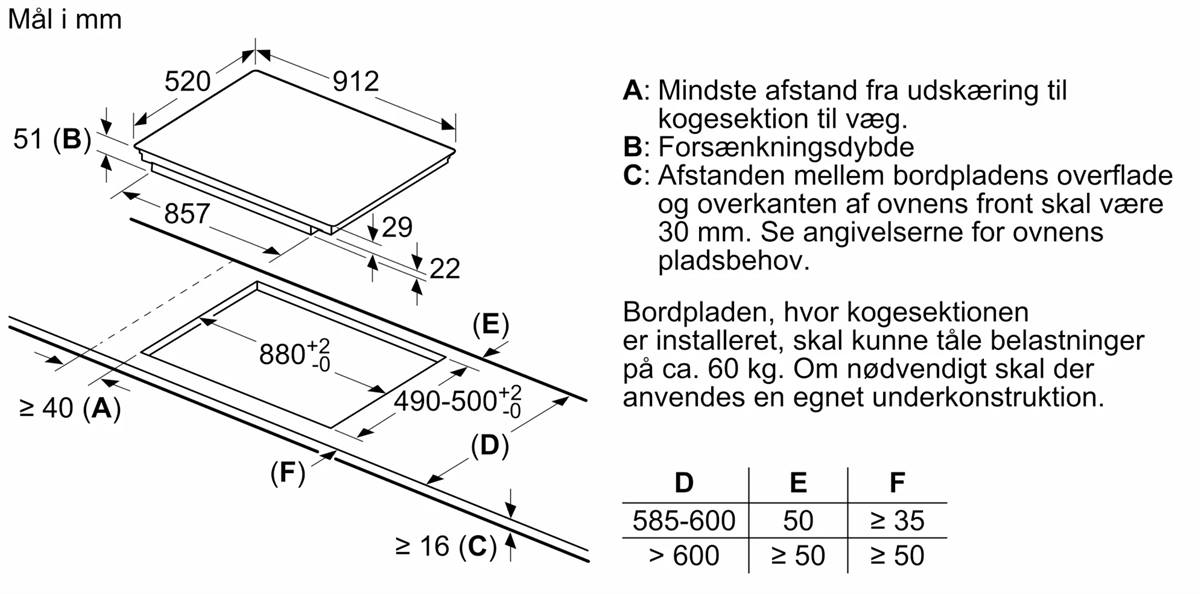 • Krævet niche-størrelse til installation (HxBxD mm) : 51 x 880 x (490 - 500)