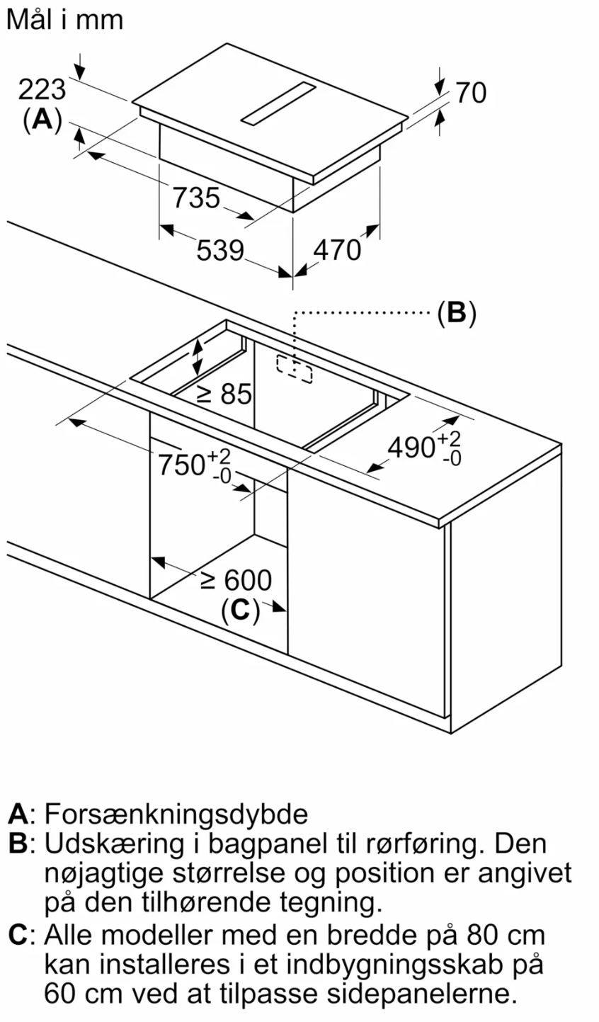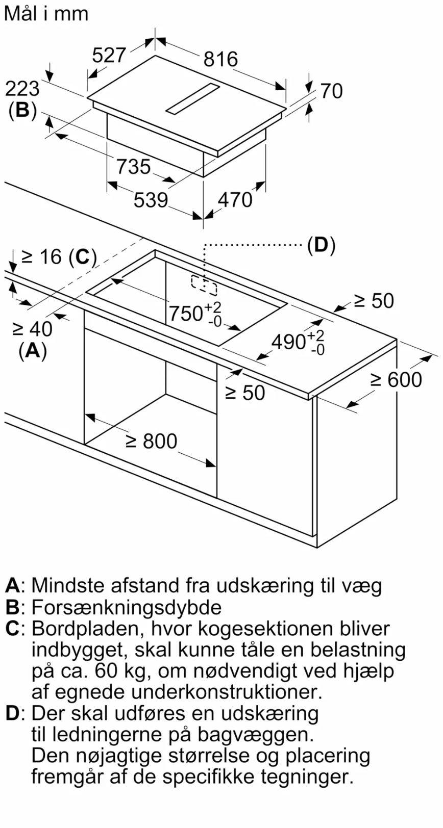 • Krævet niche-størrelse til installation (HxBxD mm) : 223 x 750 x (490 - 490)