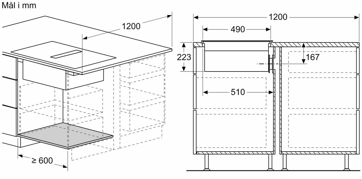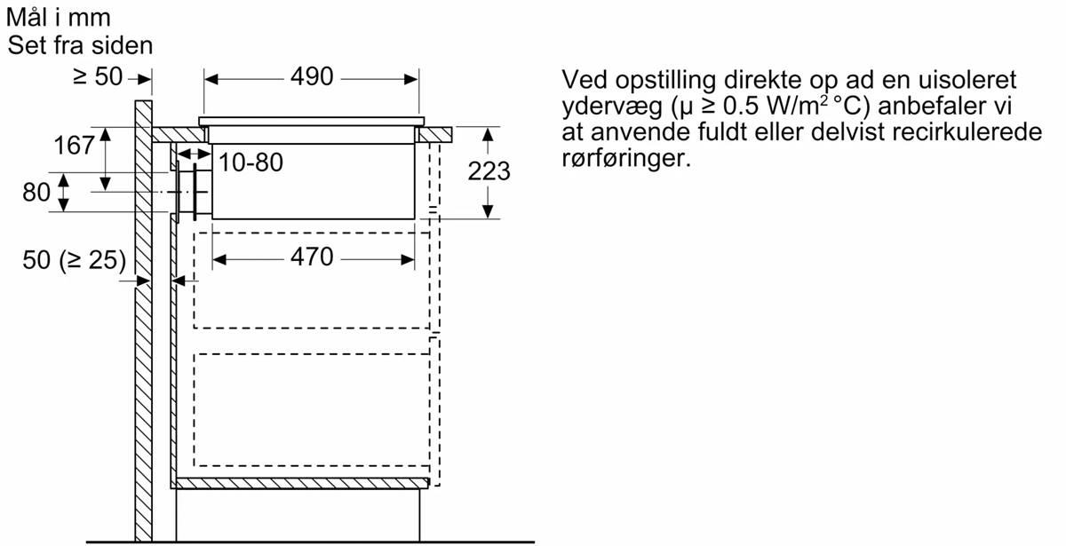 • Ved delvist kanaliseret og ukanaliseret recirkulation skal der overholdes en afløbsåbning ≥400 cm² i sokkelområdet. Åbningen kan udføres med gitter, lamelgitter eller forkortede sokler afhængigt af køkkenmøbelproducentens valg.